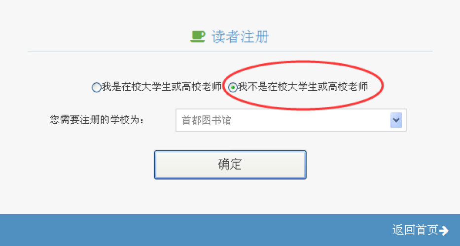步骤三(勾选“我不是在校大学生或高校老师”,需要注册的学校选择“首都图书馆”)