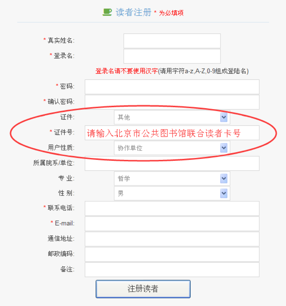 需要注意的是:在填写个人资料的时候,证件选择“其他”,证件号填写北京市公共图书馆联合读者卡号,用户性质为协作单位,填写完毕后点击确定,等待工作人员审查,审查通过后就可以正常使用了。