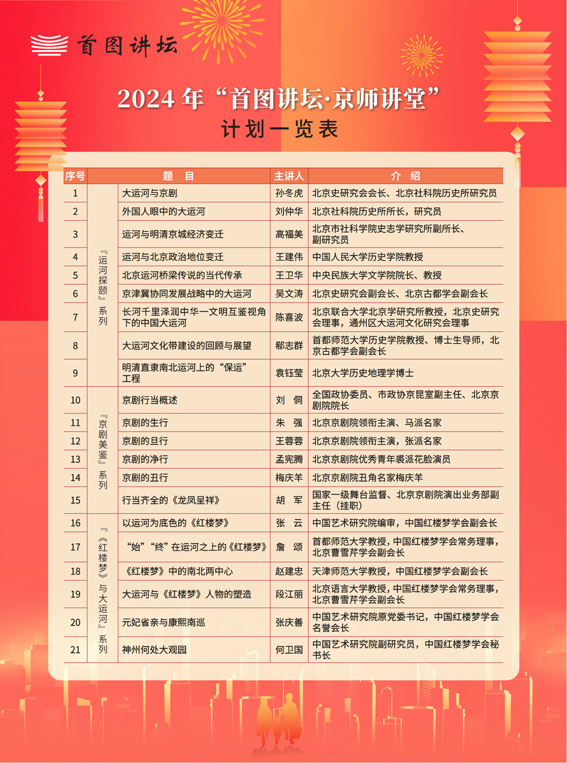 孙冬虎会长发布“京师讲堂”2024年度主题讲座计划(见附件1)。全年近50场讲座,既有北京胡同四合院、三山五园、明清北京商业、龙年说龙等多姿多彩的历史文化与社会生活主题,更是别具匠心地策划四项专题系列讲座:“运河探颐”系列将以大运河的历史变迁与运河文化的挖掘、研究、传承为焦点,展示北京城市发展与大运河的密切关系;“京剧美鉴”系列致力于让听众体味京剧国粹的独特风韵与文化价值;“《红楼梦》与大运河”系列将挖掘中国古典小说的巅峰之作《红楼梦》与世界文化遗产大运河之间的密切关联;“清朝宫廷”系列将还原清代宫廷生活的真实场景,提升听众关于清代历史与文化的准确认知。