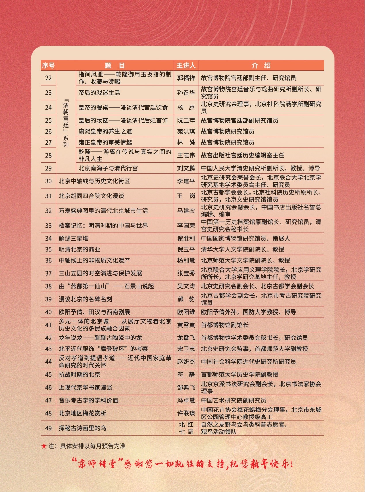 新年新气象,新名新风貌。“京师讲堂”将依托首都图书馆“一馆三址”的服务新格局,立足新舞台、抓住新契机,继续讲好北京故事,传承京华文脉,续写崭新华章。