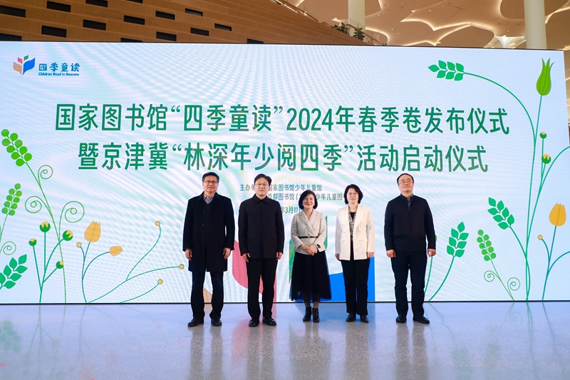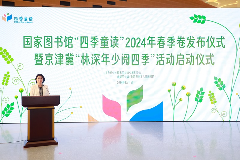 3月11日,由国家图书馆少年儿童馆、首都图书馆联合主办的“四季童读”2024年春季卷发布会暨京津冀“林深少年阅四季”活动启动仪式在北京城市图书馆正式举行。国家图书馆党委书记、副馆长陈樱,北京市文化和旅游局二级巡视员常林出席发布会并致辞。国家图书馆副馆长张军,国家图书馆少年儿童馆馆长李晓明,首都图书馆馆长毛雅君,天津图书馆党委书记李冠龙,河北省图书馆馆长刘栋,国际儿童读物联盟(IBBY)原主席、中国儿童文学研究会常务副会长张明舟,儿童文学作家殷健灵及通州区、雄安新区等京津冀区域图书馆等领导参加活动。首都图书馆副馆长李念祖主持发布仪式。