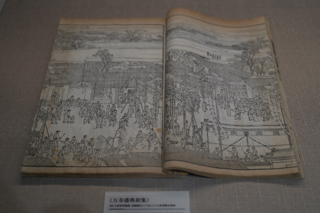 《钦定大清会典图》是以图说形式记载清朝典章制度的专书,其礼类版画记录了各大坛庙的建筑布局和祀典陈设,还原了中轴祀典的盛况。以武英殿为主的官方刻书机构所出版画制作精良,称殿版版画。首都图书馆馆藏典籍《万寿盛典初集》是康熙年间殿版画的代表,记录了庆贺康熙六旬寿辰的仪仗场面,尽显中轴威仪。清末石印术传入后,石印版画插图蔚然成风。《点石斋画报》是早期石印图像的典型代表,由画家吴友如主持编绘,以一种富于时代特色的绘画新风创作时事新闻画,既记录了进贡、祝寿、祭祀等皇家典仪场面,也描绘了别岁、冰嬉等民间生活图景。此外,实物展品还展出了版画发展史上的代表作,如水印木刻的巅峰之作《十竹斋书画谱》《芥子园画谱》,方便读者近距离品赏版画的独特美感。