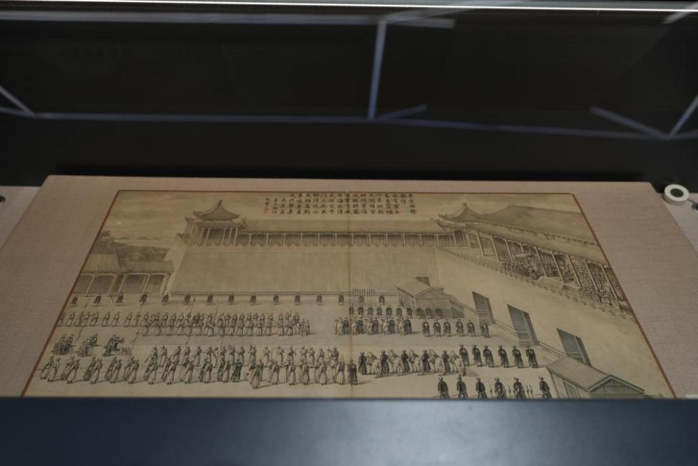 明清之际相继入华的使团创作了大量纪实类图文笔记,记录了不同时期西方人眼中的北京,随荷兰使团出行的约翰·尼霍夫在《紫禁城中的觐见》就描绘了使团在太和殿广场等待顺治帝接见的场面。而以《伦敦新闻画报》为代表的画报的产生,则让各大报社得以新闻报道的形式宣传北京,极大地提升版画的准确性,从康熙后期开始,欧洲的铜版镌刻技术随着西方传教士的入华而融入了殿版版画中。堪称18世纪铜版画艺术的巅峰之作《乾隆平定准部回部战图》,于乾隆年间由意大利人郎世宁等宫廷西洋画师奉旨绘制,耗时十五年在法国巴黎雕刻完成,展现了乾隆朝的文治武功。展览展出了《乾隆平定准部回部战图》的其中一幅作品真迹,绘图精美、镌刻精良、纸精墨润,难得一见。