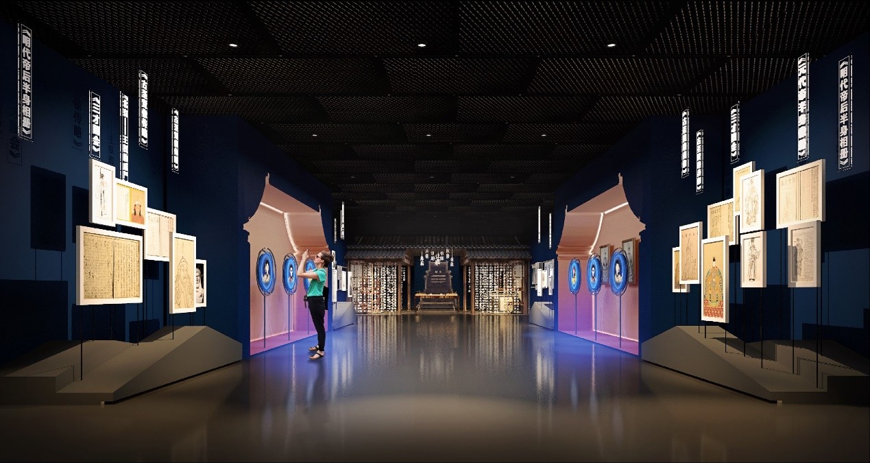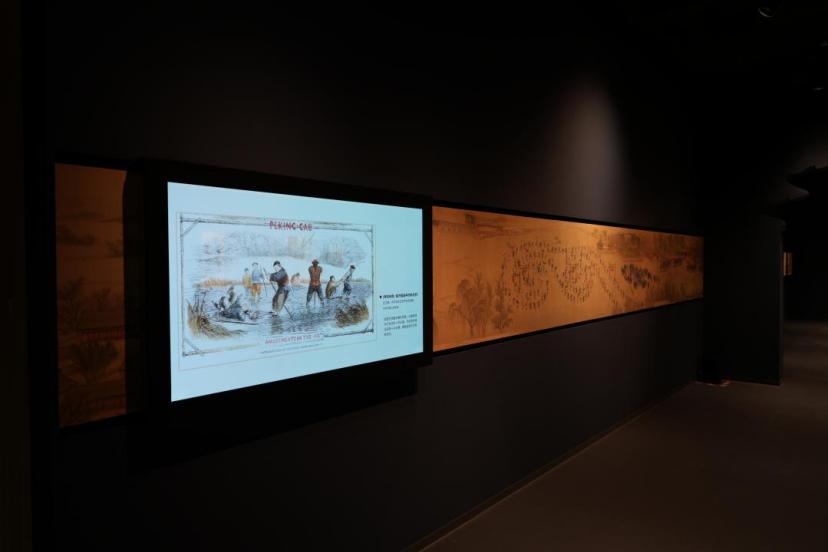 “中轴揽胜”单元中央通道打造了50米辉煌璀璨的中轴长廊,由一组透明立面屏呈现,是目前国内最长的北京中轴线当代艺术多媒体装置,系统地为观众呈现了中轴线重要点位的历史故事。同时,动态演示装置与静态艺术装置相融合,为读者营造出亲临中轴的独特体验。“中轴韵致”单元巧设艺术景箱、搭建万寿盛典图交互屏、铺排冰嬉图互动滑轨屏,让观众能趣味性地了解中轴仪仗和皇家冰嬉盛况。“中轴人物”单元还有人机对话交互系统可让读者与忽必烈、明成祖、康熙等历史人物开展有趣的古今对话。
