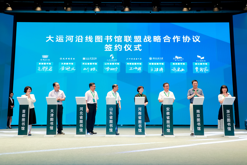 首都图书馆馆长毛雅君致欢迎词,致敬创办首都图书馆的先辈和长期支持图书馆事业发展的各界力量。北京市文化和旅游局二级巡视员常林出席并致开幕辞。常林在致辞中指出:“公共图书馆作为知识传播的枢纽,在新质生产力生产中大有可为,应自觉发挥示范引领作用。图书馆界的专业交流将推动全国图书馆事业高质量发展”。其后,来自中国大运河途径的京津冀鲁豫皖苏浙八家省级图书馆共同签署《大运河沿线图书馆联盟战略合作协议》,八馆实行轮值主席馆制,将全面开展专题文献建设、馆际交流及馆员培训等合作,并携手举办“大运河文化阅读行”活动,通过强强联合,依托“大运河”主题,发挥图书馆在八省文旅共融互通、城市文化交流合作的平台作用。