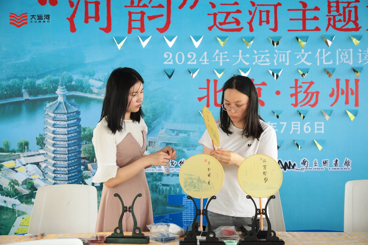 墨拓留痕,精选首都图书馆馆藏古籍《新鐫草本花詩譜》与扬州市图书馆馆藏古籍“绿野泛舟”图,制成雕版、石碑,让市民体验中华传统拓印技艺,再现几百年前的草木花诗与扬州园林风光。扇用绢帛制成的团扇,市民可进行书写、钤印,印制古代抬盐运盐、盐船开江的场景,感受百年前运河上舟楫往来、满载待发的繁忙与喧嚣。还有穿针引线体验制作四眼线装书的装帧技艺;修复破损的《扬州画舫录》“满汉席”页(仿制品),体验古籍修复技艺,感受让破损书页重焕生机的喜悦;以及琳琅满目的文创产品、传统手工艺体验、非遗产品等,让市集人气爆棚,市民流连忘返。