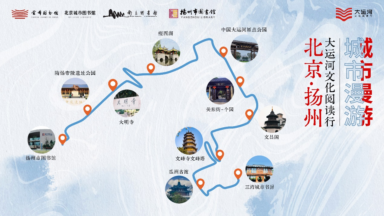 活动漫游车从扬州市图书馆出发,途经隋炀帝陵遗址公园、大明寺、瘦西湖,抵达中国大运河原点公园,去领略大运河扬州段的历史与文化。而后,穿过个园、文昌阁、文峰塔,到瓜州古渡头感受运河文化中的经典佳句。