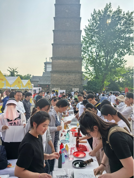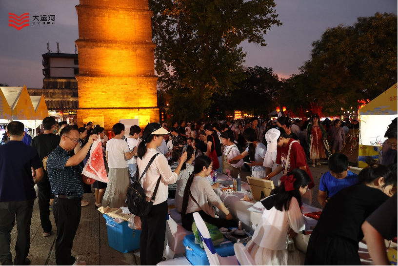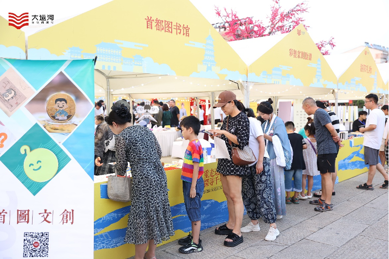 市集设置了北京及洛阳非遗展示和体验区、主题展览区、手工制作区、诗文互动区等多个区域,为读者和游客带来沉浸式体验和感受。北京及洛阳非遗展示和体验区展出了京绣、洛绣、京派风筝、金镶玉、牡丹香、京剧脸谱等创意文创;主题展览区则展出了百余种大运河主题图书、首都图书馆馆藏文献的大运河北京段珍贵图片、隋唐运河诗文佳作;手工制作区的线装书制作、雕版印刷、传拓等系列DIY体验,给予了游客身临其境的感受;诗文互动区的现场NPC互动、古琴演奏等多种舞蹈与器乐的古风演绎,让活动现场诗意盎然。
