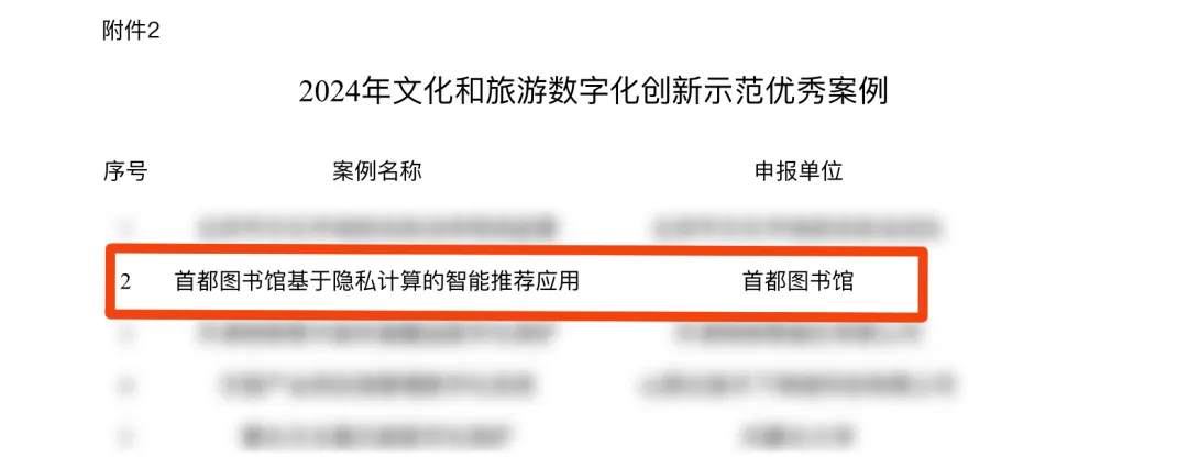 近日,文化和旅游部公布了2024年文化和旅游数字化创新示范“十佳案例”和“优秀案例”,“首都图书馆基于隐私计算的智能推荐应用”入选“优秀案例”。