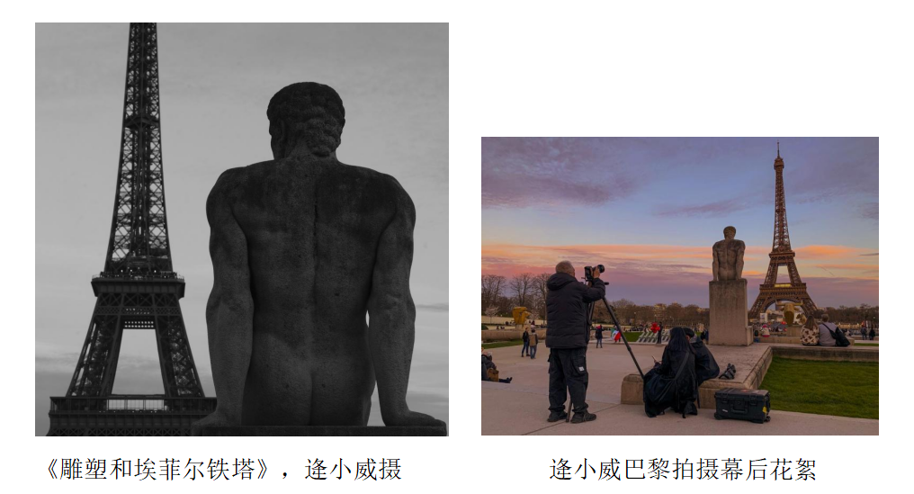 “地标不仅是符号,更是人与时空的诗意共生。”逄小威这样诠释他的创作理念。作为中国摄影家协会会员、英国皇家摄影协会会员,他以黑白肖像见长,作品被全国各大美术馆、博物馆收藏的数量逾2000幅。2024年巴黎之行中,他穿梭于卢浮宫的晨曦、玛黑区的石板巷陌,用胶片定格绚烂光影,更以黑白人像捕捉巴黎市民的深邃目光,成为展览中“人文温度”的灵魂注脚。展览中一幅黑白摄影作品,定格了逄小威在巴黎特洛卡代罗花园的创作瞬间。拍摄当天,暮色浸染天际,埃菲尔铁塔镀着粉金色余晖,金属的冷峻、晚霞的温柔、市井的烟火定格在画面中,编织出巴黎的日常诗篇。