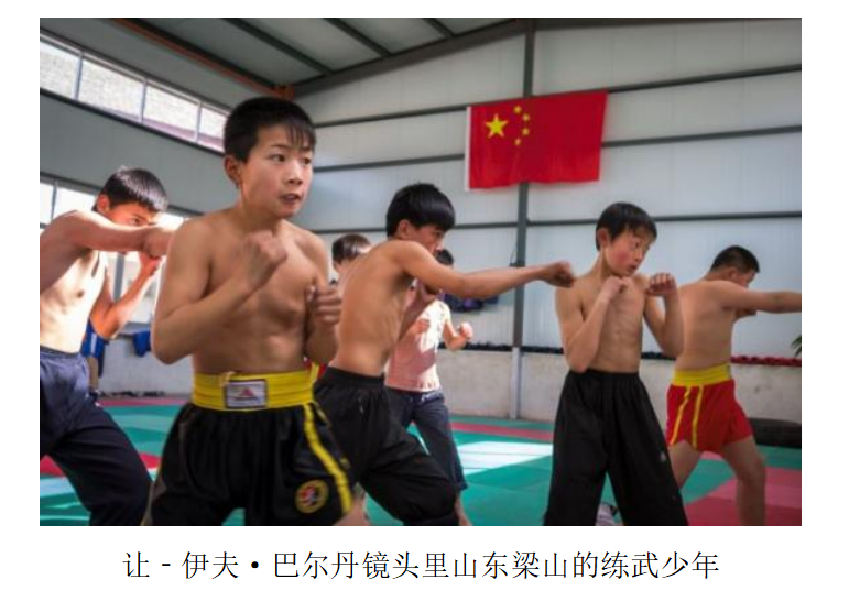 法国摄影师让‐伊夫·巴尔丹的镜头,则向巴黎讲述着东方的故事。展览中一幅作品聚焦山东梁山的一家拳馆——画面中少年们目光如炬,挥拳的瞬间凝结力量与信念,背景墙上国旗鲜红,诠释着东方少年的锐气与家国情怀。