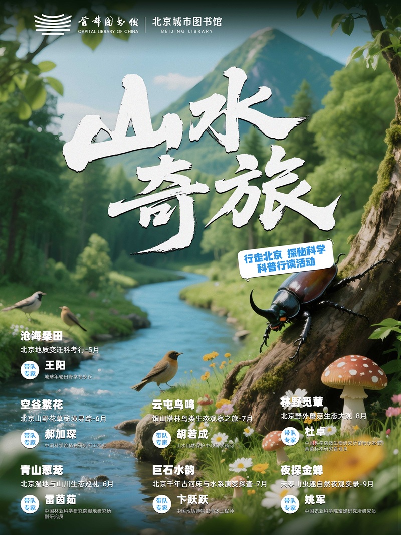 “山水奇旅”科普行读活动,作为“行走北京 探秘科学”的第二季,将环境、景观与体验,通过科普赋能的创新方式,进行生动而富有深度的呈现,于5月至9月开展七场行读活动。未来,读者还将走进阳台山风景区赏花识草,认识它们与自然、环境、人类的关系;在永定河休闲森林公园认识湿地类型,了解“地球之肾”的关键功能;沉浸在北京银山塔林,来一程鸟类生态观察之旅;踏入十渡山水,探查北京千年古河床与水系演变;行走在百花山观察了解丰富的菌物生态,制作真菌标本;在夜幕下的天泰山,探秘昆虫的隐秘世界。
