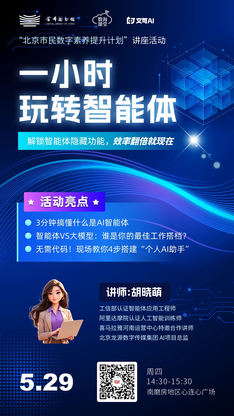 为响应国家数字化发展战略,提升北京市民数字素养和数字技术应用能力,首都图书馆开启了“北京市民数字素养提升计划”。5月29日,讲座将走进社区,为居民普及AI智能体应用,以沉浸式互动体验进一步引导读者掌握AI技能,并介绍首都图书馆数字资源使用方法,让科技创新切实赋能美好生活。