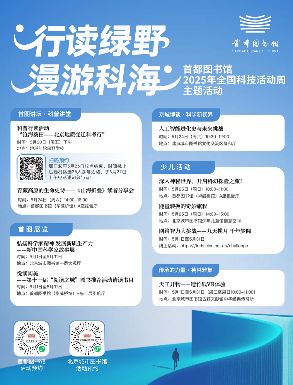 2025年5月24日,值第25个全国科技活动周之际,首都图书馆围绕“行读绿野 漫游科海”主题,精心策划了科普行读、数字素养课程、图书分享、科学家故事展等多项科技活动,构建多元化科学体验场景,推动科学知识传播与流动,让科技思想发光焕彩。