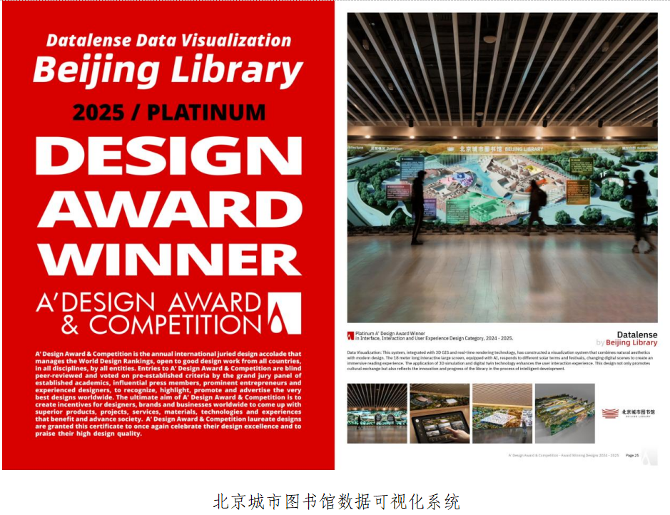 4月,北京城市图书馆的元宇宙体验馆荣获2025年度Vega Digital Awards最佳交互金奖,“北京城市图书馆数据可视化系统”荣获2024-2025年度A'Design Award大奖白金奖。