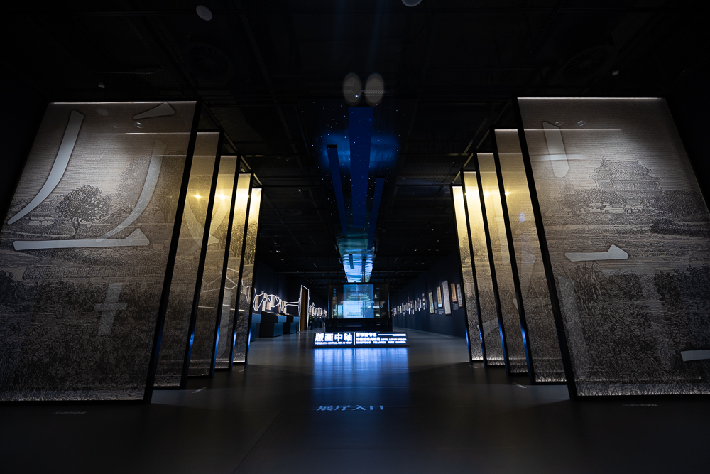 在北京中轴线申遗成功之际,首都图书馆推出“版画中轴——珍藏版画典籍展”,今年3月斩获德国iF设计奖。展览以版画为核心线索,分为四个单元及一个互动探索板块,引领观众开启一场跨越时空的穿梭之旅,徜徉于中轴线建筑、文化、艺术与人物的历史长河中。整个展厅在空间策略上汲取了北京中轴线的建筑特征——对称与阵列,整体设计风格庄重恢宏。